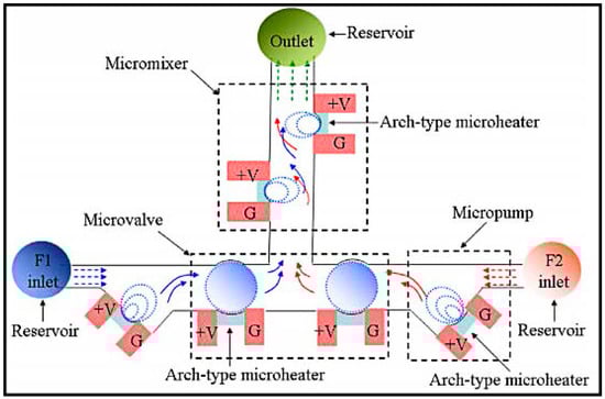 - Huang, C.; Tsou, C. The implementation of a thermal bubble actuated microfluidic chip with microvalve, micropump and micromixer. Sens. Actuators A: Phys. 2014, 210, 147–156. [Google Scholar] [CrossRef]