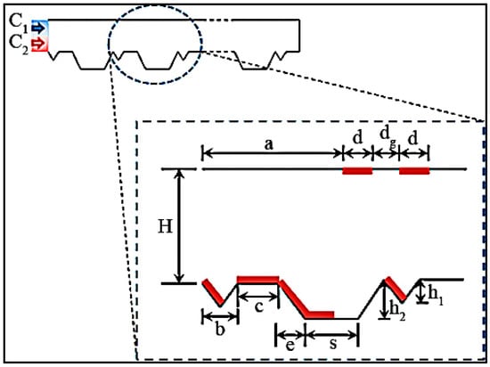 Micromixer driven by electrothermal effect also involves lots of multi-physics phenomena which could be used in micromixers [59,60,62]. Recently, Kunti et al. [63] proposed an alternating current electrothermal micromixer consisted of eight pairs of asymmetric electrodes with AC voltage. As shown in Figure 9, in this micromixer waviness of the floor increased the contact area between two fluids and lateral vortex pairs were generated by symmetric electrode pairs located on the top wall. A mixing efficiency of 97.25% can be achieved under a flow rate of 1.794 μm2/min.