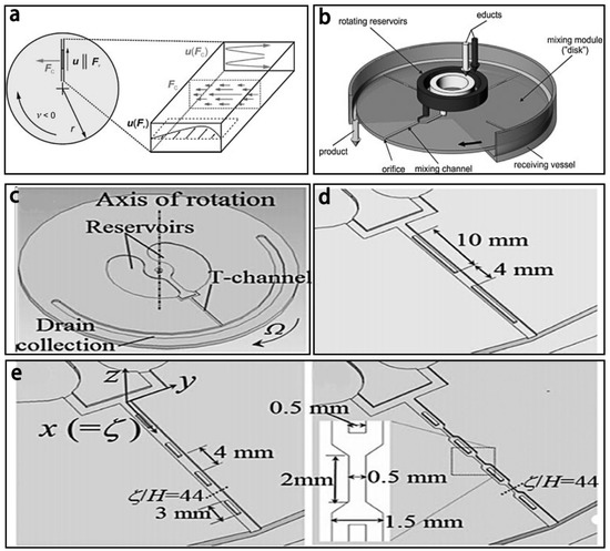(a) The force analysis: Fc is the Coriolis force, Fv is the centrifugal force, u(Fc) is the transverse of fluids; (b) Schematic of the centrifugal mixer; (c) Schematic of the microchannels; (d) with two obstructions; and (e) with four obstructions. Reproduced with permission from [90,91].