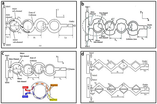 Schematic of the (a) unbalanced collision based micromixer; (b) unbalanced collision based micromixer with fan-shaped cavity in major sub-channel; (c) unbalanced collision based micromixer with stagger structure; (d) unbalanced collision based micromixers with two-split rhombus channel and with three-split rhombus channel. Reproduced with permission from [95,96,130,131].