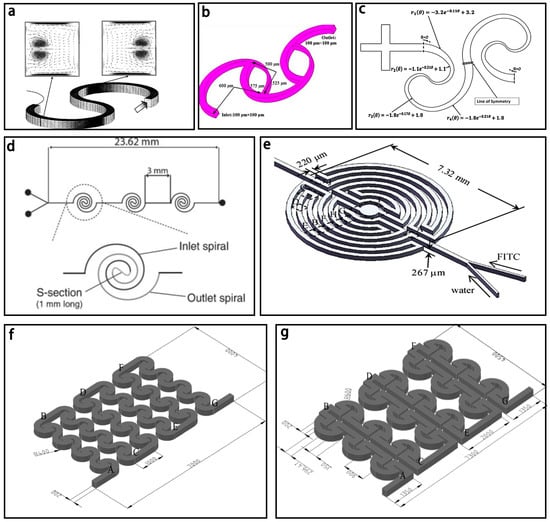 (a) Schematic of the spiral micromixer (The arrow indicates the flow direction); (b) Schematic of the parallel laminar micromixer; (c) Schematic of the spiral based micromixer with sequential logarithmic structure; (d) Schematic of the double spiral based micromixer; (e) Schematic of the labyrinth-like multiple spiral based micromixer; (f) Schematic of the spiral based micromixers with interlocking semicircles; (g) Schematic of the spiral based micromixers with omega-shaped channels. Reproduced with permission from [114,132,133,134,135].