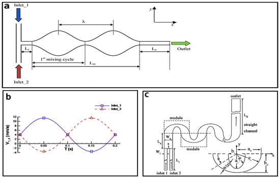 (a) Schematic of the convergence-divergence based micromixer; (b) The inlet flow velocities of the convergence-divergence based micromixer; (c) Schematic of the convergence-divergence based micromixer with meandering channel. Reproduced with permission from [102,136].