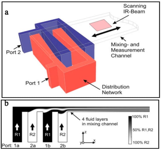 - Buchegger, W.; Wagner, C.; Lendl, B.; Kraft, M.; Vellekoop, M.J. A highly uniform lamination micromixer with wedge shaped inlet channels for time resolved infrared spectroscopy. Microfluid. Nanofluid. 2010, 10, 889–897. [Google Scholar] [CrossRef]