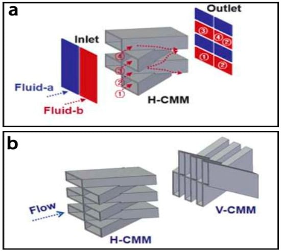 (a) Schematic of the lamination based micromixer with crossing manifold structure; (b) The horizontally crossing manifold micromixer (H-CMM) and the vertically crossing manifold micromixers (H/V-CMM). Reproduced with permission from [141].