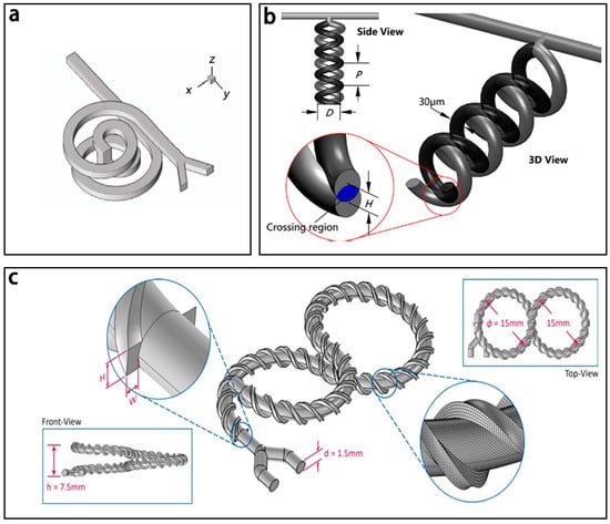 - Liu, K.; Yang, Q.; Chen, F.; Zhao, Y.; Meng, X.; Shan, C.; Li, Y. Design and analysis of the cross-linked dual helical micromixer for rapid mixing at low reynolds numbers. Microfluid. Nanofluid. 2015, 19, 169–180. [Google Scholar] [CrossRef]