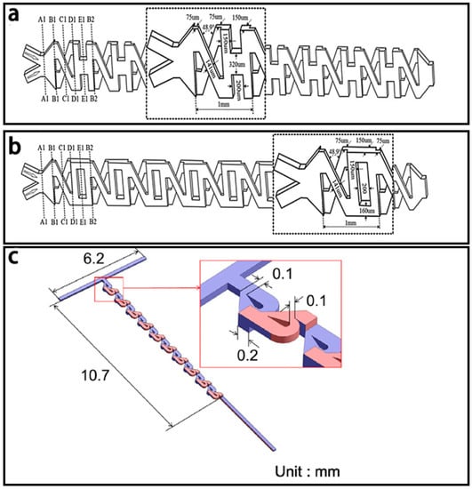 Micromixers are often classified as active and passive mixers [8,9,10]. Active micromixers generally require external energy sources, such as electrical, magnetic, and sound fields, etc., while passive micromixers don’t require external energy input except the energy for driving the fluids and often use complex channel geometries to enhance the diffusion or chaotic advection. The structures of active micromixers are often relatively simple and the mixers are easier to control, but the requirement of external energy sources makes them more difficult to integrate. Passive mixers are much easier to integrate into microfluidic devices, but they often require complex fabrication processes.