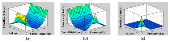 The 3D surface viewer graphs. (a) The dependency of flow rate on % loss and curve height. (b) The dependency of flow rate on pressure and curve height. (c) The dependency of flow rate on % loss and pressure. (d) The dependency of flow rate on Reynolds number and pressure. (e) The dependency of flow rate on curve height and Reynolds number. (f) The dependency of flow rate on % loss and Reynolds number. Figure 4g presents the dependency of velocity on % loss and curve height. (h) The dependency of flow rate on pressure and curve height. (i) The dependency of velocity on % loss and pressure. (j) The dependency of velocity on Reynolds number and pressure. (k) The dependency of velocity on curve height and Reynolds number. (l) The dependency of velocity on % loss and Reynolds number.