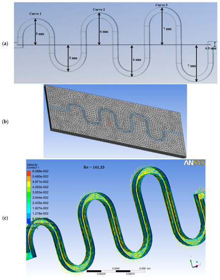 The computational domain of ASMC is represented in three dimensions (3D). The channel has been designed with three ascending curves of increasing radii, by using design modeler tool. The length of the channel has been taken as 51 mm. The model is sinusoidal in shape, with the dimension of 0.9 mm for width and the same for depth. The model consisted of inlet, outlet, and the wall. For accurate results, mesh independence has been carried out by varying the cell density of the model for similar boundary conditions. This procedure has been followed for fine mesh tetrahedrons to discretize the computational domain. The meshing has been done for up to 7524 elements and 2541 nodes. Moreover, a high-resolution scheme has been selected as the solving option. The model has been set for two domains, like fluid and solid. In the fluid domain, blood has been used as fluid. Besides, silver has been used in the solid domain. Here, flow regime has been applied at the inlet of microchannels, with normal velocities of 0.02 m/s, 0.03 m/s, 0.04 m/s, 0.05 m/s, 0.06 m/s, and 0.07 m/s. In the set up section of ANSYS Fluent, turbulent kinetic energy and turbulent dissipated rate have been set at 5 m2/s2 and 4 m2/s3. In the set up section, the fluid temperature has been taken as 320 K. In calculations, the Reynolds number for the microchannel was determined by the following equation: