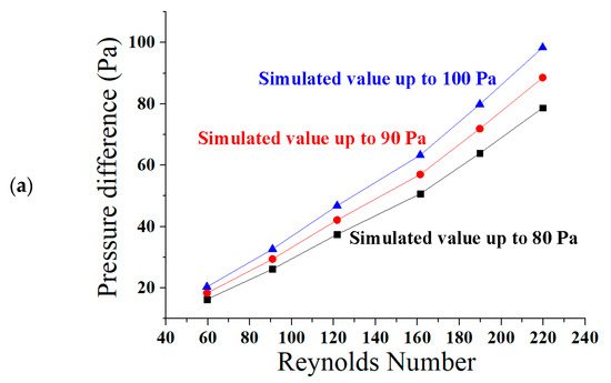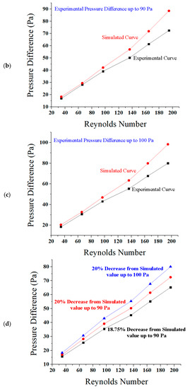 Comparison of graphs between Reynolds number and pressure difference in simulations and experiments (a) at 80 Pa; (b) at 90 Pa; (c) at 100 Pa; (d) percentage decrease from simulated data to experimental data; and (e) Reynolds number vs. flow rate in testing.