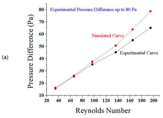 In Figure 9a,b both curves are almost matched at Reynolds numbers less than 100. The graphs have shown a little deviation for Reynolds numbers greater than 100. It has been observed that the flow is laminar throughout the channel for all curves. The slope of the graphs based on simulation is more increased than the curves based on experiments for the Reynolds number 100. Figure 9c presents a collective comparison of decrease in the values of pressure difference in experimental testing. There is a decrease in the values of pressure difference in the experiment as 20% at 100 Pa, 20% at 90 Pa, and 18.75% at 80 Pa. The reason for this deviation is the frictional factor and the ascending nature of the microchannel, as explained above. The direct relation between Reynolds number and the pressure difference is shown below in the graph Figure 9d. The curves are almost matched at all Reynolds numbers. The flow is laminar throughout the ascending sinusoidal microchannel for all simulated and experimental curves. There is also a similar decrease found in the values of pressure difference in experimental testing from the simulated data. The direct relation of Reynolds number and the experimental flow rate is discussed in the next graph in Figure 9e. This experimental graph presents a little deviation because of frictional factors and the ascending nature of the microchannels, as discussed above. Flow rate is increased gradually along with the Reynolds number. At Reynolds number 164.88, the flow rate and velocity are found as 0.5843 nL/s or 5.843 (0.1 nL/s), and 0.05843 m/s or 5.843 cm/s, respectively.