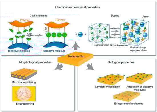- Vallejo-Giraldo, C.; Kelly, A.; Biggs, M.J.P. Biofunctionalisation of electrically conducting polymers. Drug Discov. Today 2014, 19, 88–94. [Google Scholar] [CrossRef] [PubMed]