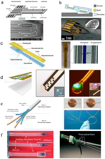 - Ziegler, D.; Suzuki, T.; Takeuchi, S. Fabrication of flexible neural probes with built-in microfluidic channels by thermal bonding of Parylene. J. Microelectromechanical Syst. 2006, 15, 1477–1482. [Google Scholar] [CrossRef]