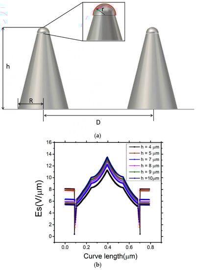 The Mo tip surface is designed and fabricated to be, the first order, hemispherical. The bottom radius R is set to be 5 µm. The height of the tip is h. The distance d between the anode and the top of the Mo tip is 100 µm. The red line on the surface of the hemisphere, in Figure 2a, denotes the probed surface under study. Figure 2b shows the electric field distribution along the red line as a function of height of the Mo tip, where r is 0.25 µm, and the curve length is 0.785 µm. The cathode and anode bias are 0 V and 1000 V, respectively. The maximum surface electric field on the Mo tip, as a function of height, was observed to increase from 11.3 V/µm to 13.6 V/µm given the notable geometry mediated field enhancement.