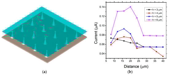 Figure 3b shows the field emission current as a function of h and D for a radius of 0.25 µm. The distance between two Mo tips increase from 8 to 40 µm with the tip height increasing from 3 to 6 µm. From the simulation results in Figure 3b, the emission current increases with the incensement of h. The emission current reaches the maximum when the distance D is approximately three times the height h. Compared with our experimental results below, upon geometrical optimization, the current was observed to increase by two orders of magnitude. Figure 4a–c is the simulated beam trajectories from graphene-coated Mo tip array, with 3D side view, front view and top view of the field emission.