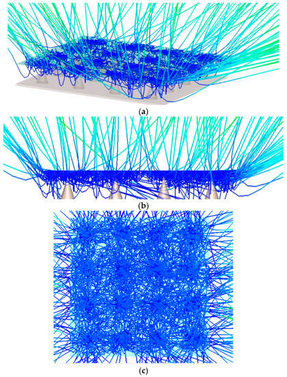 Simulated beam trajectories from graphene-coated Mo tip array (a) 3D side view; (b) front view; and (c) top view of the field emission.