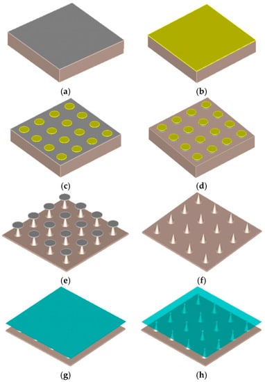 A schematic description of the fabrication processes flow for the graphene-coated Mo tip array is illustrated in Figure 5 []. For brevity, as shown in Figure 5a, a double-side-polished, 400 mm thick, 4-inch high purity (99.95%) Mo wafer was first coated with an evaporated 500 nm thick Al film to form etch mask. The tip array was subsequently patterned by photolithography (Figure 5b,c), with the Al patterned by dry etching in CH3F plasma (Figure 5d) []. The Mo tip array was etched using an anisotropic SF6 dry etch in a commercial ICP etcher (Sentech PTSA 500, SENTECH Instruments GmbH, Berlin, Germany) (Figure 5e). Residual Al was removed by ultrasonication (15 W) for 60 s (Figure 5f). PMMA/graphene films were transferred onto the Mo tips (Figure 5g) by standard PMMA transfer [], outlined later, with the PMMA subsequently removed by heating to obtain the sample with graphene uniformly covering the Mo tips (Figure 5h).