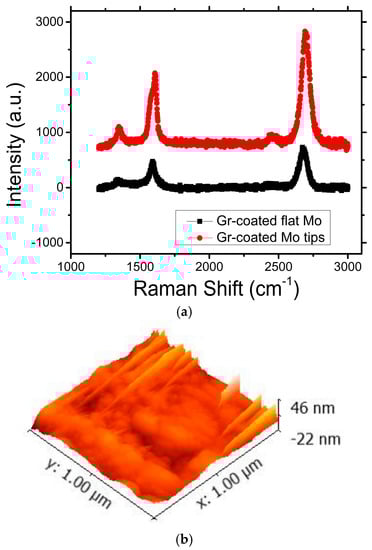 Experimental results of (a) the Raman shift of graphene-coated flat Mo chip and graphene-coated Mo tips; and (b) surface roughness of the graphene on the Mo tips.