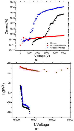 Three different FE cathodes were measured and compared: pristine Mo tip array, graphene-functionalized Mo tip array, and graphene-coated flat Mo chip. Typical I-V characteristics are shown in Figure 8a, with the corresponding F–N plots shown in Figure 8b [].
