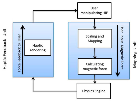 The presented research intends to boost the human-in-the-loop nano-manipulation for targeted drug delivery through haptic interaction. Since the haptic device is inherently a bilateral device, it is essential that two separate units should be considered for effective haptic interaction. The first unit is the mapping framework which enables the user to steer MNPs by changing magnetic force. The second unit is the haptic rendering which exerts a haptic force to the user in the case of contact of MNPs to the virtual walls. The physics engine acts as an interface between the two units of the haptic engine. The mapped magnetic force from the haptic device movement acts as an input to the physics engine and MNPs average position acts as an input for the haptic rendering unit. One of the challenging problems to integrate the force feedback is how the physics engine satisfies the high update frequency (1000 Hz) of haptic rendering for stable force feedback. Since the frequency of the physics simulation is limited to 100 Hz in the physics engine, the physics engine and haptic engine are made to run in an asynchronous execution [30]. Figure 5 illustrates the two main haptic units of a tele-nano-manipulation system.