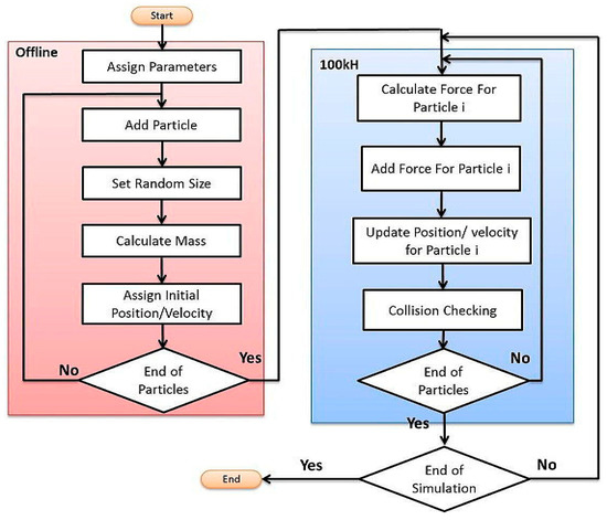 A physics engine is responsible for generating the real-time position of nanoparticles at each time step. C++ language is used to make our physics engine. Particle based modelling is the basis of physics engine simulations. Particle based modeling uses a particle system which typically includes massive collection of particles generated from one or more locations in space. The motion of particles is determined by external forces acting on each particle [31]. Various steps of simulation at the physics engine are shown in Figure 6. After initializing the particle system, forces acting on each particle should be calculated at each time step using Equation (1), and then the positions of particles can be achieved through numerical integration. If there is no collision between a particle and a blood vessel, the same position is kept; otherwise, the position of the particle is recalculated after collision check with the channel walls. The physics engine is running at 100 Hz update rate. Table 1 presents the parameters used in the simulation studies. The diameters of MNPs are chosen randomly between 400 nm and 1000 nm. Even though this variation in size of the nanoparticles changes the amount of magnetic force received by each particle, it makes the simulation more realistic.