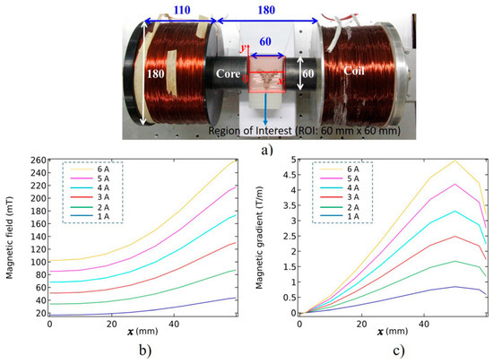 Relationship between input current and magnetic field intensity, and magnetic field gradient using a single-coil-core system at the center of the region of interest (ROI).