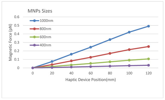 The main goal of our tele-nano robotic system is to guide MNPs inside the virtual blood vessel by applying appropriate magnitudes and directions of magnetic force to change the positions of nanoparticles inside the vessel. In our system, we mapped the deviation amount of Y-axis position from a neutral home position of the haptic device to the input current of electromagnetic actuators. The parameters and formulae of our developed virtual system are based on our real electromagnetic actuation system (Figure 7) for magnetic nanoparticles, whose targeting efficiency had been studied through simulations and experiments [32,33,34,35]. The relationship between the input current and magnetic field intensity, and magnetic field gradient at the Region of Interest (ROI) is presented in Table 2 (obtained from the experimental data of our previous study [35]). By using Equation (4), we can compute the amount of magnetic force on each particle given the magnetic field gradient. Because our real actuators have a magnetic force in one axis, we need to map one dimension of the haptic device to a current value and then apply the magnetic field gradient associated with it from Table 2. Besides, results in [12] show that a minimum magnetic gradient of 0.7 T/m would be enough for the purpose of targeted drug delivery. Thus, our system which has a maximum gradient of 2.8 T/m at ROI center can navigate the magnetic nanoparticles. In this paper, we have utilized the same magnetic gradient as we had used for in vivo experiments on mice [36]. Results in [36] show that MNPs successfully reached the mouse’s brain and the evidence of blood-brain barrier crossing was also observed. Figure 8 illustrates the mapping between the workspace of the Phantom Omni mapping from −120 mm to +120 mm to the current value 0 A to 6 A for each actuator. The negative sign will prompt the direction change of the magnetic force by changing the actuator current. In this simulator, the sizes of nanoparticles are chosen randomly between 400 to 1000 nm. The resultant magnetic force, generated from the movement of haptic device, on a particle is shown in Figure 9. As seen in Figure 9, the magnetic forces on a particle are quite weak. However, the MNPs always exhibit aggregation phenomenon inside a magnetic field. For a realistic simulation, a mean aggregate size was considered based on [37]. As explained in [37], the particles grow rapidly into a “local aggregate” at this length scale (<1000 nm). The diameter of a “local aggregate” particle can increase to about 10–100 times when compared with the diameter of a single particle. Thus, a force factor corresponding to a particle with a diameter increased by a factor of 10 has been added to make the simulation more realistic.