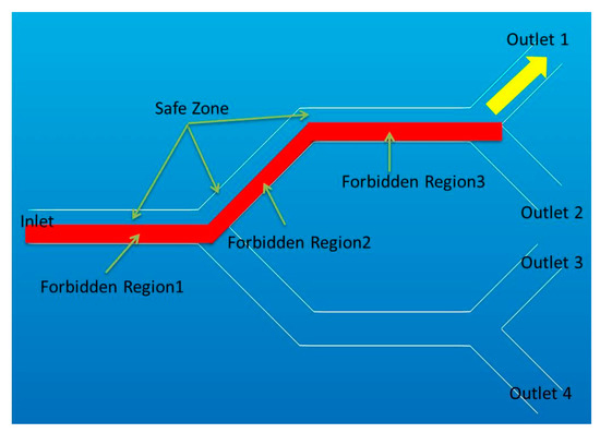 Forbidden region and safe zone for a multi-channel blood vessel with outlet 1 as target outlet.