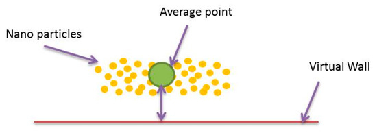 The second challenge happens because the vessel is composed of a multi branch. As mentioned earlier, MNPs tend to disperse under magnetic force. This issue makes the first solution ineffective. To overcome this challenge, we propose a regional averaging for haptic rendering with multi-particles. In the regional averaging, we only calculate the average of MNPs’ positions at a separate region for each branch. If the regional average position of MNPs passes the virtual wall, a feedback force is rendered to a user through the haptic device (see Figure 10). In the cases where two different regional averages pass the virtual wall but their directions are opposite to each other, we give a priority to the regional average that has more number of particles in the region. The amount of the feedback force applied to the user is calculated based on: