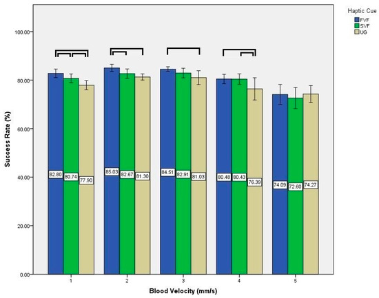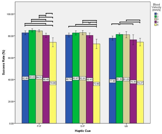 Effects of a blood velocity on success rate during various haptic cues. Here, each ﹇ represents a statistically significant difference between the underlying two conditions.