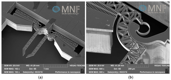 - Bagolini, A.; Ronchin, S.; Bellutti, P.; Chiste, M.; Verotti, M.; Belfiore, N.P. Fabrication of novel MEMS microgrippers by deep reactive ion etching with metal hard mask. IEEE J. Microelectromechanical Syst. 2017, 26, 926–934. [Google Scholar] [CrossRef]