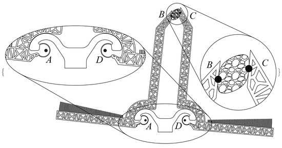 A fundamental component of the developed microsystem can be represented as in Figure 2, where the mobile jaws show up in a possible configuration. A controlled-desired displacement of the right hand side jaw can be obtained by actuating the left hand side jaw, through the elastic response of a grabbed tissue sample. By virtue of the adopted CSFH Conjugate Surface Flexure Hinge it could be shown that points and are quite stationary during actuation and therefore they can be considered the rotation centers of the two jaws [54,55]. Considering also that the two jaws are rather stiffer than the tissue samples, the four-bar linkage can be adopted to model the whole microsystem, provided that the coupler link is allowed to have a variable length.