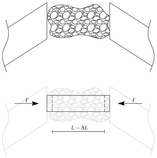 More specifically, the tissue sample is modeled by using the continuum mechanics theory, as a homogeneous and isotropic material. According to the multi-scale, three-level hierarchical approach for mechanotransduction proposed by Lim et al. [53], the model proposed in this Section can be classified at Level 1. Therefore, the tissue sample is considered as a beam element with constant cross-section (with area ) subjected to the axial load . With reference to Figure 3, the normal strain is defined as , whereas the normal stress is equal to . Assuming a linear elastic behaviour for the material, according to the Hooke’s law the stress-strain relationship can be written as , where is the Young modulus. By using the definitions of normal stress and normal strain, the previous equation can be written as