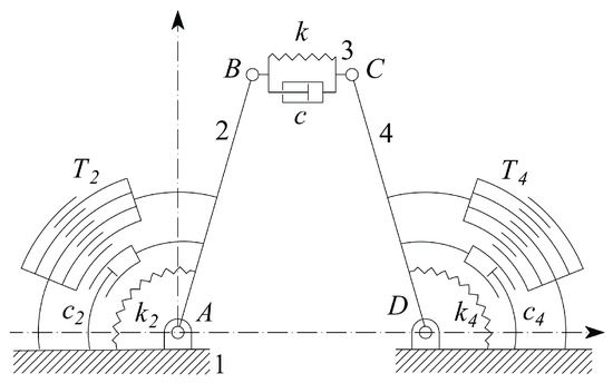 Assuming that a jaw and its corresponding comb teeth mobile set can be approximated as a whole pseudo–rigid system, Euler’s rotation equation can be written twice, to express the dynamic balance of the left and right jaw systems during rotations, namely,