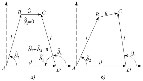 - , and refer to the variations of the angular positions of the link vectors , and , with respect to their initial position; in this way their actual absolute angular positions will be , , , respectively;