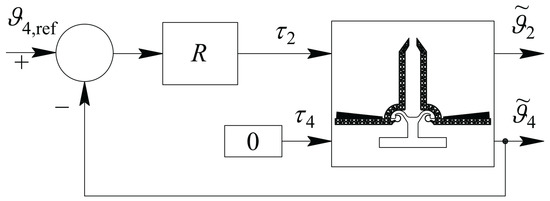 This effect can be obtained with a manual operation, in which the input voltage is slowly increased, in a quasi-static condition, until the desired angle is reached, or under a control system, which brings the angle to the desired value . In this paper, we will design the control scheme accordingly to the second option, as represented in Figure 7, where block represents a Regulator. In the case under study, consists of a PID (Proportional-Integral-Derivative standard regulator), and represents the control block which generates the input torque on the basis of the position error, between the desired angle and the actual one , until it goes, asymptotically, to zero.