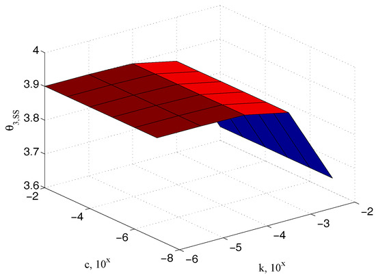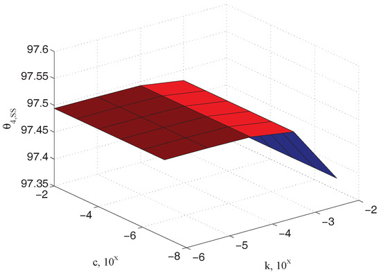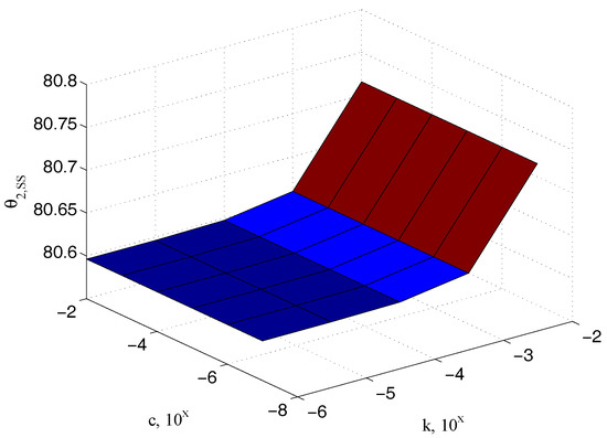 Figure 8 depicts the steady state values of the output measured angle as a function of the unknown parameters and (In the following simulations the parameter values indicated in Table 1 have been used. The plane dimensions of the specimen are approximately m m), confirming the physical observation that it has to be dependent on the elastic coefficient only. Similar relationships can be referred to the input and the sample angles, as reported in Figure 9 and Figure 10, respectively.