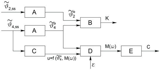 With reference to Figure 11 and considering that noise cannot be neglected in real applications, Type blocks are those whose outputs consist in the constant steady state values of the angles and ; noise reduction can be obtained designing as an averaging filter or, somehow equivalently, as a low pass filter with a bandwidth . Type block computes the inversion of the relationship between the amplitudes of the input and output constant values as a function of the elastic coefficient . Such a relation is represented by the gain of the system under linearity hypothesis; in a more general case, it is a nonlinear function which can be analytically or experimentally computed.