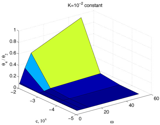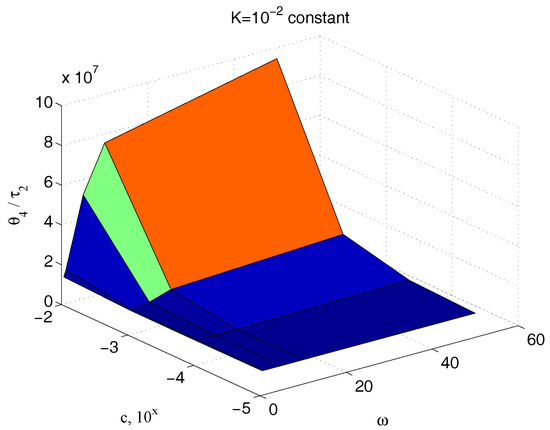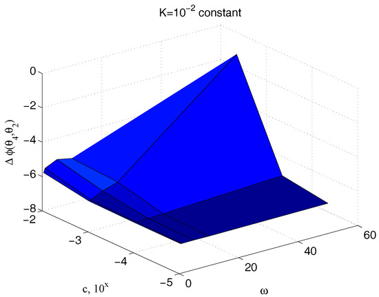 The relationships between input and output under sinusoidal signals involve also the phase delay between the two signals. Figure 17 illustrates the dependency of on the sample viscosity and the signal angular frequency for an assigned value of the sample stiffness , while Figure 18 shows how the phase delay depends on and , when the system is operated by the same pulse . The marked sensitivity of on is confirmed.