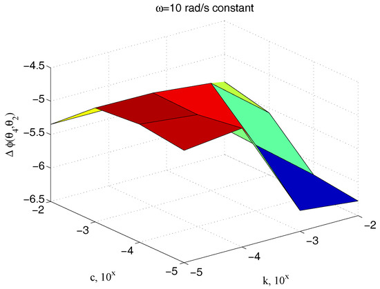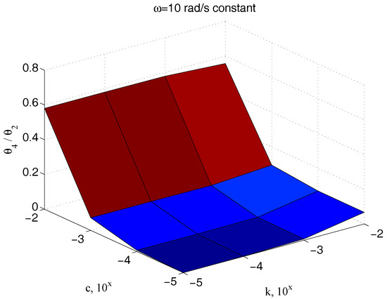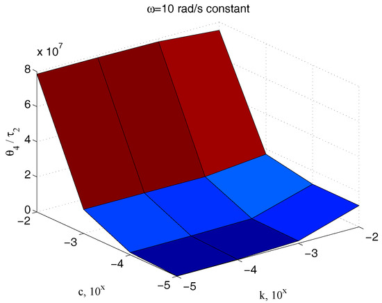 Figure 13 reports the ratio of the amplitude of the sinusoidal output to the corresponding input couple , for different values of the parameter and for different frequencies, keeping the value of the elastic term constant, . The great dependency of such a quantity from at all the pulses greater than rad/s confirms the effectiveness of the technique here proposed for its measurement. An equivalent result is obtained if the same ratio is depicted for different values of both the parameters and , for a fixed frequency. Figure 14 shows once again the high dependency of such a measure from .