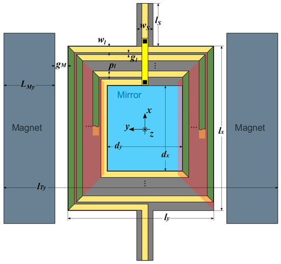 The structure of the mirror is shown in Figure 1, and all the quantities used in the paper are defined in Table 1. It includes a rectangular plate, at whose center a rectangular reflecting surface (covered with a metal film to increase reflectivity [24]) is positioned. The reflecting region is surrounded by a multi-loop rectangular inductor, in the form of thick metal lines patterned on the plate. Two beams with rectangular cross-section, at two opposite sides of the plate, act as suspending torsional springs for the plate itself, as well as carriers for the electrical input and output lines. Two block-shaped permanent magnets face the other two sides of the plate, and provide the magnetic field required for actuation. When a current is forced through the inductor, a Lorentz force appears on the loop sides parallel to the suspensions. The combined effect of these forces results in a torque on the plate, which rotates around the axis of Figure 1. The restoring torque is provided by the suspension springs. A few simplifying assumptions will be used in the derivation of the constitutive equations. Specifically, we assume that (1) the plate behaves as a rigid body during actuation and consequently (2) all the deformation is sustained by the springs (i.e., we use a lumped parameter model); and (3) the dynamical behavior is dominated by the actuation mode (rotation around ), while other modes are at high frequencies and are not relevant.
