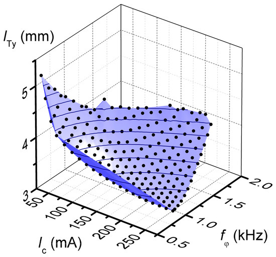 The solution of the minimization problem (19) was implemented as a Wolfram Mathematica script. Specifically, was minimized numerically, with the constraint parameters and swept uniformly between 0 and 1, for a total of more than 400 minimizations. To exclude technically unrealistic solutions, an inequality constraint to require a resonance frequency above 500 Hz (one order of magnitude above typical scanning frequencies), as well as an upper limit of 250 mA for the current, were also included. The total time required to determine the Pareto frontier was about 1.6 s for each point on a PC with 8 GB of RAM. Because each design variable is optimized over the reals, non-manufacturable values for , which must be in the form , with integer , may result. The impact of this issue will be verified with the FEM simulations. The optimal solutions in the objective space, defining the Pareto frontier, are shown in Figure 3.