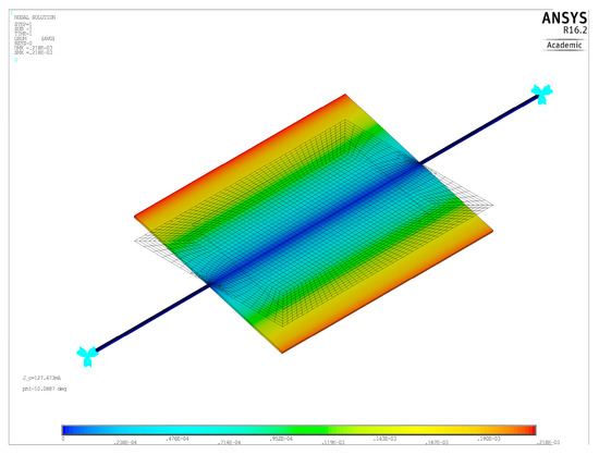In the static FEM simulations, to include the effect of the non-uniform magnetic field, a distributed vertical force (i.e., a pressure) was applied in the active areas of the plate (the ones shaded in red in Figure 2) in the ANSYS script. The value of this pressure was dependent on the magnetic field. Specifically, we assumed a uniform surface current density (Am−1) flowing in the active areas. We then applied at each mesh node of the active area a pressure equal to , where () were the coordinates of the node, and the expression of was determined through the formulas in Appendix A. To include the effect of large rotations of the plate, which produces a reduction of the effective arm of the magnetic torque with respect to the rest position, the pressure was further reduced by a factor , with being the target angle (10°). A typical deflected shape for static simulations is shown in Figure 4. For modal FEM simulations, the frequency of the lowest mode was computed, and it was verified that it corresponded to the torsional mode.