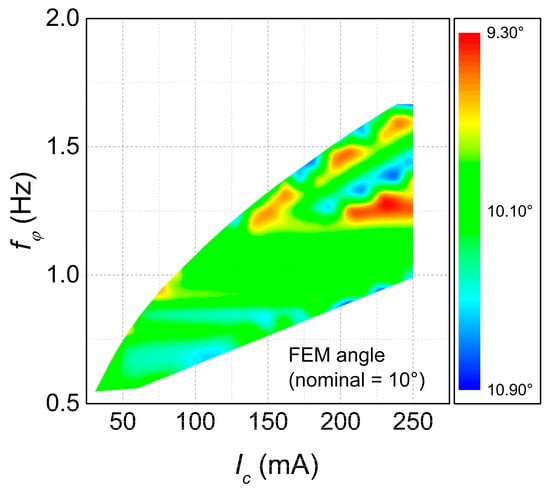 Overall, there was a good agreement between the performances of the geometries as optimized by the Mathematica code, both for the static deflection and resonance frequency. Over the 271 geometries of Figure 3, the average FEM angle was 10.15°, or only about 1.5% larger than the nominal value of 10°, and the standard deviation was 0.33°. Interestingly, most of this dispersion can be attributed to the rounding of the number of loops . Indeed, there is a high correlation () between the FEM angle and the rounding error of and, on average, a rounding of half a coil creates a difference of 0.60° in the deflection. The actual FEM angle, projected on the plane, is shown in Figure 5.