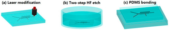 Microfluidic devices are not only prepared in fused silica, but also are processed on polymer materials [12,13]. Polymer materials have poor stability and resistance to acid and alkali. Fused silica is an ideal material for microfluidic applications; it has very high optical transparency, low background fluorescence, chemical inertness, and hydrophilicity [14]. Therefore, preparing microfluidic devices inside fused silica can be very effective. However, it is still challenging to fabricate three-dimensional (3D) microfluidic chips in hard/brittle materials like fused silica. Research on micromixer fabrication is crucial to microfluidic chip development.