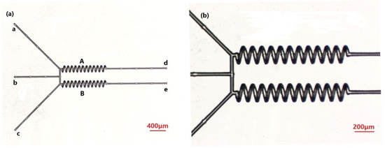 The first structure, shown in Figure 2, is composed of multiple channels to mix substances simultaneously or separately. The structure of the micromixer group is made up of two helical microchannel structures (A, B), three inlets (a, b, c), two outlets (d, e), and many microchannels. For the helical microchannel, the number of turns, length, helical pitch, circle diameter, and depth of the helix axis with respect to the sample surface are 12, 1200, 100, 150, and 175 μm, respectively. The diameter of the cross-section is 35 ± 1 μm. In previous studies, there was inhomogeneity of several microns in size. However, in this work, the size error of a single helical structure can be controlled to be between 1 and 2 μm, which greatly improves the uniformity of the device. Meanwhile, the size error of multiple helical structures can be controlled to be between 1 and 2 μm, which ensures consistency of the device. This improvement is achieved by adopting more efficient power and accurately adjusting the scanning speed. The power and scanning speed of the machining process are adjusted according to the structure.