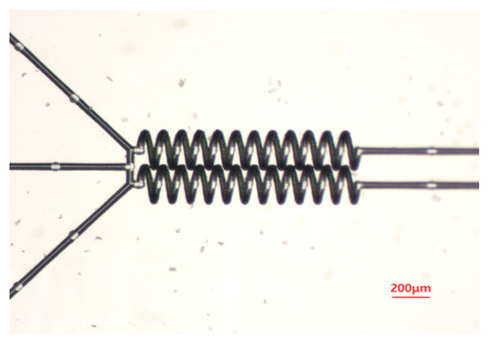 For the multiple mixers group, as well, integration is an important performance index. Femtosecond laser micro-nano processing technology can improve integration of the microfluidic chip. On the one hand, in previous studies we were able to obtain significantly higher mixing efficiency of the 3D helical mixer than of the straight channel, and also reduce the size of the chip to save space [19]. On the other hand, reducing the spacing between each unit is an important way to improve integration. As can be seen in Figure 1, the spacing between the two spiral channels is only 100 μm.