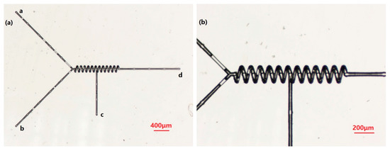 The second micromixer structure we designed is shown in Figure 4. It is a micromixer used to mix different substances in a particular order. It consists of three inlets (a, b, c), a spiral microchannel, and one outlet (d). For the helical microchannel, the number of turns, length, helical pitch, circle diameter, and depth of the helix axis with respect to the sample surface are 12, 1200, 100, 150, and 175 μm, respectively. The diameter of the cross-section is 35 ± 1 μm.