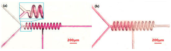 We conducted a simple test of the mixing performance of the functional mixer for specific effects of functional mixing. As shown in Figure 5a, NaOH solution (concentration 0.1 M) and phenolphthalein solution (concentration 0.05 M) were injected simultaneously into the two entrances, a and b, respectively, by a syringe pump at a speed of 0.1 mL/h (phenolphthalein becomes pink once mixed with a basic NaOH solution), corresponding to a flow rate of 8.3 cm/s and a low Reynolds number, Re ≈ 2.5. The c inlet did not have any substance injected. As we can see, in the spiral microchannel, the color changes to red, which proves that the two solutions are mixed. As shown in Figure 5b, after the previous step, we injected diluted hydrochloric acid (concentration 0.1 M) into the c inlet. It can be seen in the figure that in the first half of the spiral channel it remained red, while in the second half it became colorless. This proves that sodium hydroxide solution and diluted hydrochloric acid are neutralized and the phenolphthalein becomes colorless, thus proving the mixing effect of the liquid in the second half of the spiral channel.