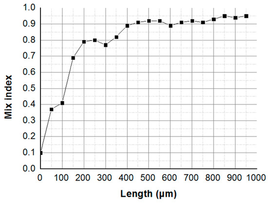 Finally, the color intensity was obtained from the captured images, pixel by pixel. The intensity of each pixel was normalized. The normalized values correspond to the degree of mixing for each pixel, 0 for unmixed and 1 for fully mixed. The mixing index was calculated as: