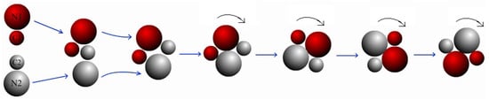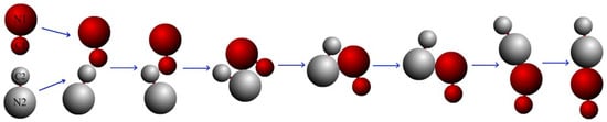 The iodate/arsenous acid system can be accurately modeled by such cubic autocatalysis []. Here, we select such a special reaction to construct the complex environment. The reactant or product in Equation (1) is then involved in the cubic autocatalytic reaction in Equation (2) taking place in the bulk phase environment, which forms a reaction network coupled by diffusion. The A and B species interact with the dimer sphere through repulsive Lennard-Jones (LJ) interactions of the form